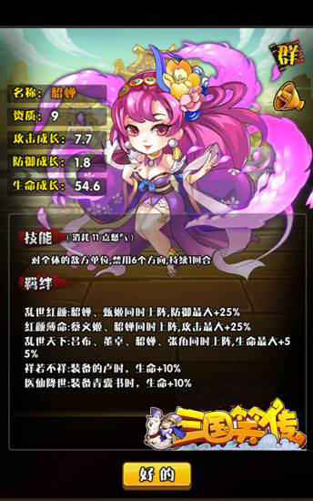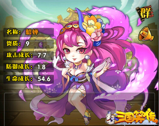 貂蝉在三国笑传中是橙色美女武将,拥有顶级资质,谁说女子不让男?从貂蝉的属性来看,她将会在三国笑传中颠覆这一谣言。