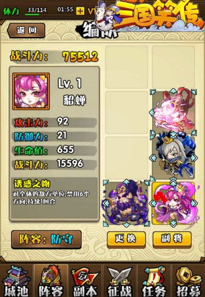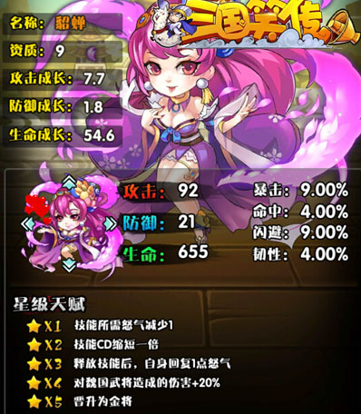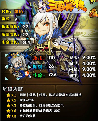 张角的防御和生命成长都是最顶级的一列,当只凭借这一点把他放在防御阵型里是不够了,他有着一个大大减少我方伤害的技能,能给我方全体武将增加75%的闪避,技能结合自身该有的闪避值,想被敌人攻击到都难。