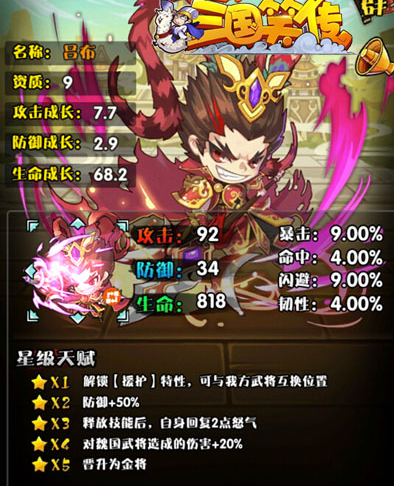 吕布本身防御成长就是所以武将中最高一列的,而且其血量成长也不低,而且他的二星天赋能增加防御50%,保命系数大增;