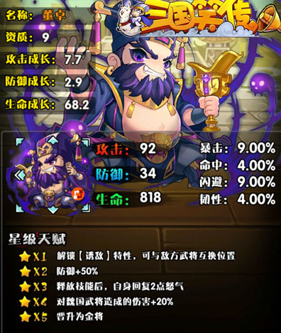 董卓的防御成长更吕布一样,都是当前最高值,达到了2.9,二星天赋也能增加50%防御,而且他的技能也是禁用敌军攻击方向的,减少我方队伍所受到的伤害;