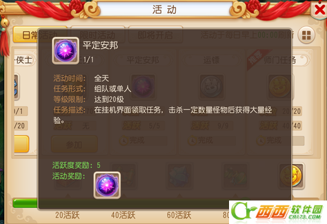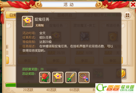 活跃度奖励:九转金丹(20点)、藏宝图(40点)、宝石(60点)、金柳露(60点)、1000金币(100点)