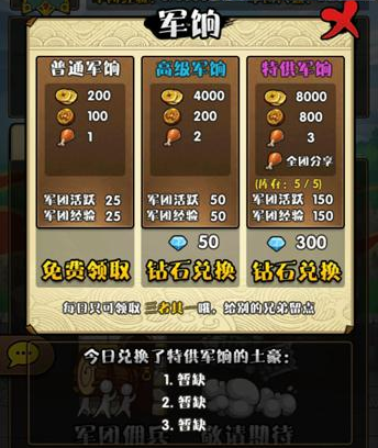高级军饷需要花费50钻石兑换可以获得4000*金币、2*鸡腿和200*军团奖牌