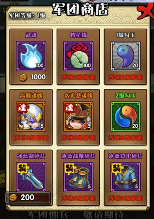 主公可以使用军团奖牌在军团商店购买各种商品。军团等级越多,可以购买更多的难得一见的稀世珍品哦!