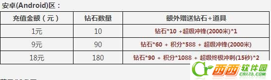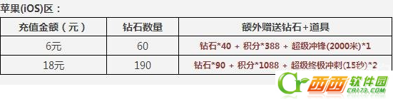 单笔充值额度大于等于18元,额外赠送90钻石 + 1088积分 + 超级终极冲刺2个(死亡冲刺15秒);