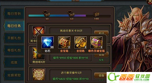 每日任务:每日任务总共可获得100钻石及各种品质宝箱、钥匙
