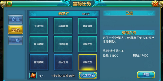 在热血仙境里除了主线修真任务外,还有着皇榜任务。