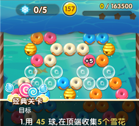 本关子弹数量较少,只提供45球,需要消除掉全部的甜甜圈才能获得雪花。关卡中吸色泡泡、曲奇饼干、定时炸弹等障碍物数量较多,需要大家多多留意子弹的使用,尽量用最少的子弹消去做多的甜甜圈。