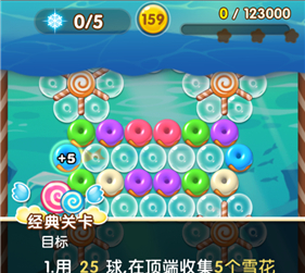 7.关卡最后,雪花被透明泡泡包覆着,我们清理掉下方的甜甜圈和吸色泡泡,直接击破透明泡泡即可收集到雪花了。