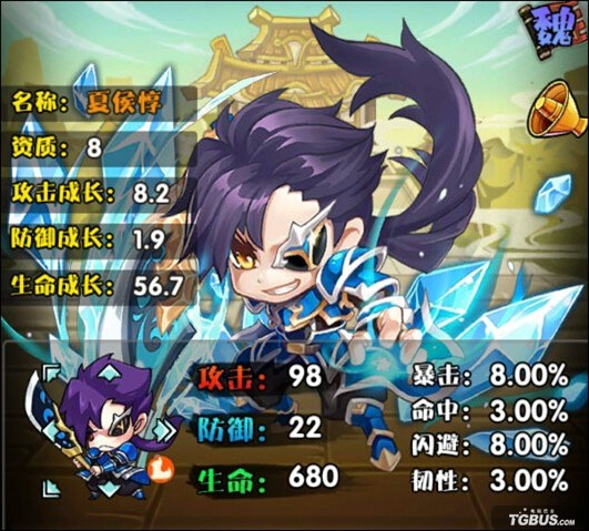 由上可以看出,夏侯惇的初始属性跟成长潜力值差不多,初始攻击力很高,比其他武将厉害不少,其他各项属性也不错,但较之顶级武将们,还是有一点些微的差距的,但其初始属性也算是能达到顶级武将的标准了。