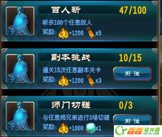 与任意师兄弟切磋3场即可,奖励1000历练+1灵兽果。胜负都行,重在参与。这个简单却很多人忘,原因是打一次要10分钟冷却。小编建议大家每完成一次每日任务就顺手点进去看看,这样就不会忘了。