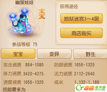推荐理由:作为参战等级为75的召唤兽,成长上肯定略胜一筹,幽莹娃娃的综合资质也是不可多得,出色的法资,不俗防资质和体资都让她成为了法宠炼妖首选;技能里第一无二的高级魔之心加固了她在法宠界的地位,而且自带一个大法:泰山压顶,真是技多不压身。说到这里,我来为大家列出法系技能,以供参考。