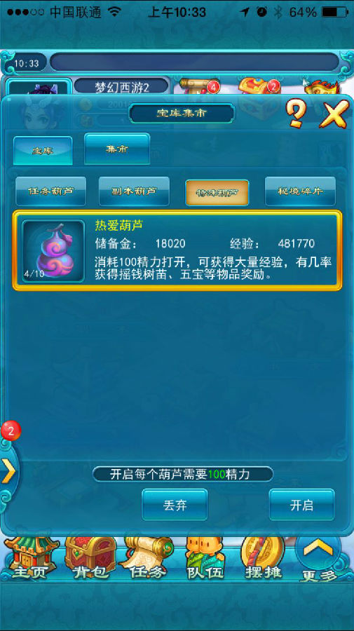 第一次传递信笺将免费获得奖励。之后每传递一次获得热爱葫芦一个,可消耗100精力打开,有机会获得摇钱树苗、五宝等奖励!