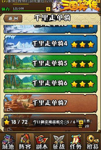 在千里走单骑中玩家每天可以挑战6次,分为不同的关卡,