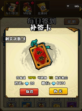 但是补签卡有上限,相应vip等级可增加补签次数。