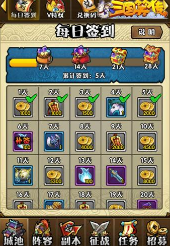 4、累计签到28天花费50钻石可购买金币*200000、功勋*100000和经验金书*2,vip7以上可额外购买一次。