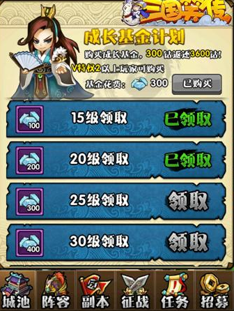 成长基金计划是个很好保值的方法,不妨购买成长基金,300钻石返3600钻,需要vip特权2以上的玩家才可以购买。