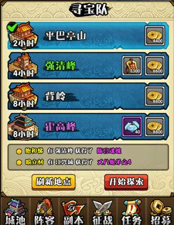在不同的地点中寻宝可以获得不同的奖励,如上图在霍高峰中寻宝就可以获得40个钻石。所以玩家可以在寻宝队中获得钻石哦!