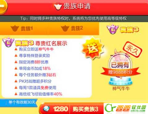 贵族3:花费钻石1280颗——增送价值9888积分的宠物神气牛牛