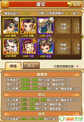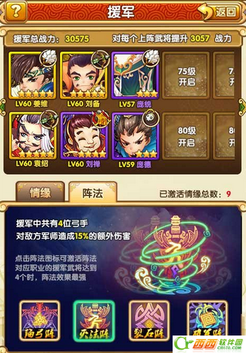 陷弓阵、灭法阵、裂石阵、破军阵,四大阵型不同加成,玩家需要将指定武将安排上阵,才会自动激活属性加成,所以一定要好好考虑如何安排上阵武将之间的缘分激活哟!