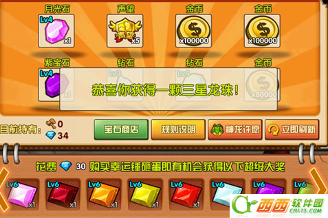 这里要说的是通过钻石购买的幸运锤有机会得到超级大奖,最高能得到6级的宝石,当然更多的还是4级宝石多一点。其次我们每砸完8个蛋就能够获得一颗龙珠。