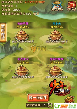 少年三国志夺粮战打法攻略,夺粮战斗打法技巧,少年三国志之前更新了新内容夺粮战,这个玩法其实有点类似于排名战,粮草就是积分,打别人的抢积分,到时候分高就能拿好奖励,下面咱们就一起来看看吧。