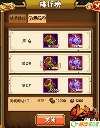 夺粮战的奖励分为战斗奖励,排行奖励,成就奖励,奖励内容以大量声望、宝物精炼石和培养丹为主。玩家战斗胜利后可以获得粮草、声望、觉醒丹奖励,而当总粮草达到指定数量时,可以领取成就奖励。活动结束时会根据总粮草(流动粮草+固定粮草)进行排名并发放奖励,排名奖励会在20:00-24:00在活动界面发放,请少年们千万不要忘记去领取。