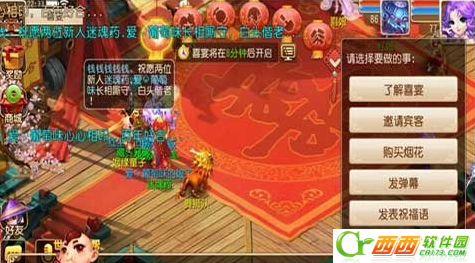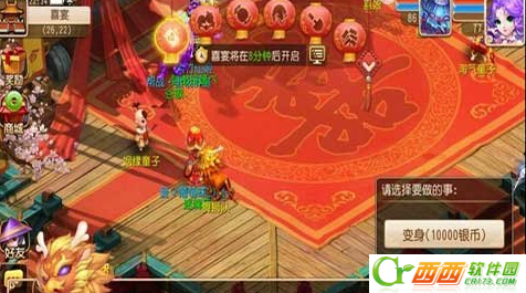 在游戏中的十分钟的准备阶段,玩家可以找到舞狮队花费银币变身不同颜色的瑞兽喔。而游戏中玩家在反复变身的时候还有一定几率变身蛟龙的喔,在喜宴开始的时候新人需要到月老那里进行拜堂,然后就可以去喜娘那里派发喜糖了喔。游戏中每个新人可以派三次喜糖,之后就是花钱派送了。婚宴上可能会有小猴子出没,所以宾客就要与其战斗了喔。