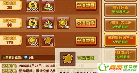 最简单的就是通过充值来拿奖励了,例如178礼包的5个证书拼图就足以我们兑换2个高级证书了。