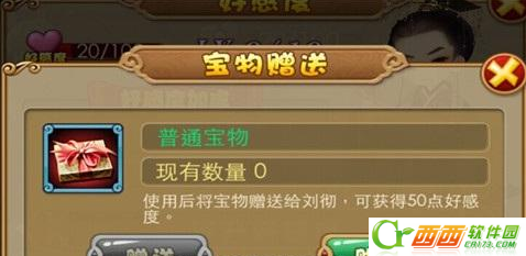 另一个获得好感度的方法就是通过赠送宝物了。宝物分为两种,一个是普通宝物,赠送后增加50好感度,另一个是赠送稀有宝物,赠送后增加500点好感度。这两种宝物的差距相差十倍,但是价格也相差十倍,所以基本上没有区别的。