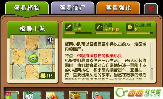 激活效果:生成一对小板栗,向前方突击,对僵尸造成伤害。