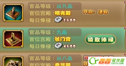接着是每天的俸禄奖励了。我们的官职越高,能拿到的俸禄就越多。不要觉得俸禄很少,要注意俸禄是按天拿,而不是按月拿的。总结下来每个月的俸禄还是不少的,尤其是在我们的官职不断上升的情况下。
