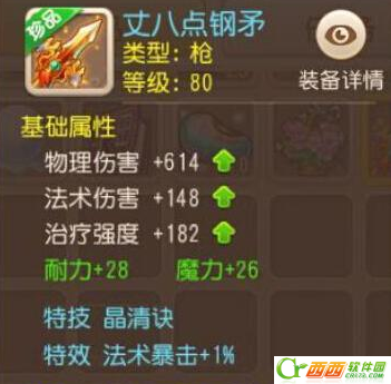 80级丈八点钢矛:满法术伤害148点,耐魔双加54点,带晶清诀特技,法术暴击+1%特效,综合评分948。