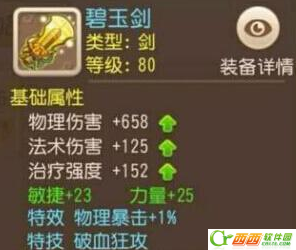 80级碧玉剑:658满物理伤害,力敏双加共有48点,带物理暴击+1%特效,破血狂攻特技,综合评分910。