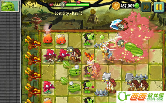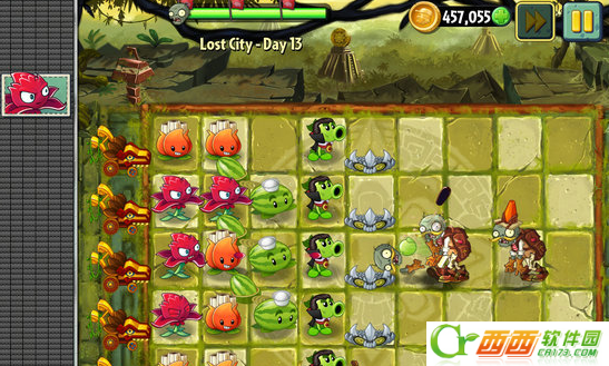 以上就是植物大战僵尸2失落之城第13天攻略,最主要的难点就是中间植物不多的时候,这个时候需要堆前排硬抗的。