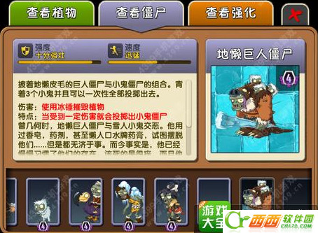 僵尸特点:披着地懒皮毛的巨人与小鬼僵尸的组合。背着3个小鬼并且可以一次性全部投掷出去。