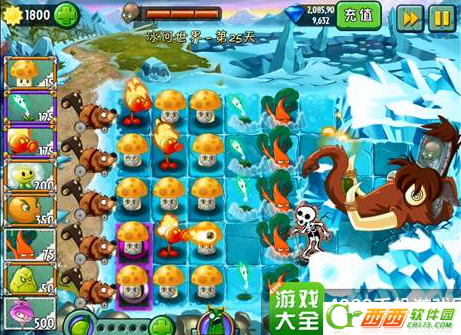 本关什么多余的东西也没有,仅仅是我方我僵尸博士深情的两两相望,僵尸博士一如既往埋在冰里,下面是它的爱宠长毛象。一上来就送玩家2000阳光,可以任意种植后再开始游戏。一开始可以先种三排阳光菇,这样可以更持久的发展,当然一口气种很多攻击植物的赌博法你们也可以试试。