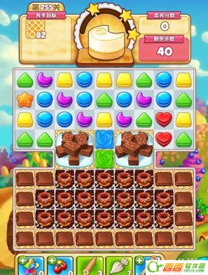 布朗尼只需要在其周围制造消除即可,另外我们还可以注意到再两个布朗尼之间还有两个硬奶油,这个一般在我们消除完布朗尼后,就很容易消除了。障碍一除,剩下的就是快速消除甜甜圈,因为可以移动,所以还是很好消除的。