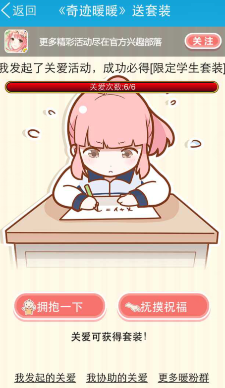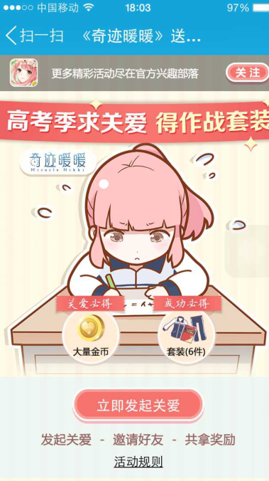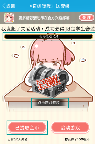 发起成功后便可领取随机赠送的金币奖励,由于完整套装免费获得是需要6个人共同“关爱一下”,所以我们就需要“邀请好友”来一起完成这个任务。
