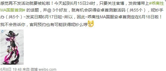 今天起到6月15日24时,只要关注官博,发微博带上#乖离性MA国服首测# 的话题,并@ 3个好友,