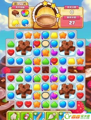 碎碎曲奇266关3星攻略,碎碎曲奇266关通关技巧,本关稍有难度,因为变色区域和布朗尼有点多,导致曲奇消除起来略有困难,而且花色并不缺少,想合出2个彩色派会有点压力。不过一旦合出第1个之后第2个难度就相对较低了。