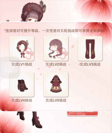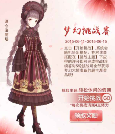 点击开始挑战,在梦幻大使给出的主题下进行评分,只有连续通过了5关才能获得全套的酒心洛丽塔的套装。