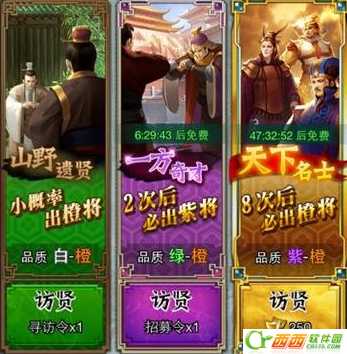 天下名士:每次需花费1个高级招将道具or250元宝/个,每两天1次免费机会,冷却时间48小时,可发现弟子品质:紫-橙