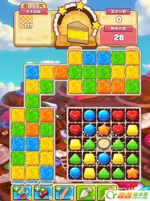 剩下的就是我们平时所做的事情了,通过曲奇消除威化饼。实话说,难度还是不小的,因为即使硬奶油消除,但是剩下的威化饼覆盖面积太大,而且我们的步数又少,所以适当的情况下可以使用道具。