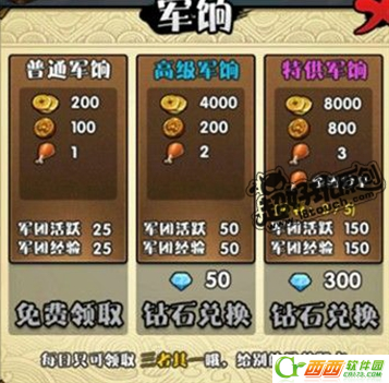 军饷:军饷有几种,分别是普通军饷、高级军饷(50钻石)、特供军饷(300钻石),特供军饷是全团中只能购买5份。