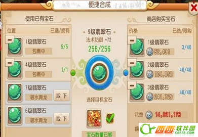 所谓的便捷合成界面,是一个集合了购买宝石、购买宝石锤的界面。在这一界面上,会自动确认你当前等级装备所能使用的最高级宝石等级,然后就按照这一等级,为你计算你需要买多少的1级宝石、2级宝石和3级宝石,你可以用身上自己的宝石加上装备上的宝石(图中显示为绿色),再加上商店购买的宝石(图中显示为蓝色),来合成高级宝石,甚至如果你是高级玩家,那么宝石锤都会帮你一个不小心就买好,所以如果你使用这个界面,又不想花费仙玉买宝石锤,那么请一定要记得把宝石锤的勾去掉。