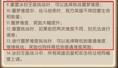 总体来说,冰封王座噩梦模式还是有一点难度的,但是只要不要点那个战斗加速还有自动战斗一般都是可以过去的,主要是开场的第一个技能,是非常重要的,还有战斗的最后自己留意有一个整体控制的技能,一般都是可以过去的,在最后一个,这是第十关,那个玩家是比较难打的刷新一下,因为那个一般比自己高战斗力的。