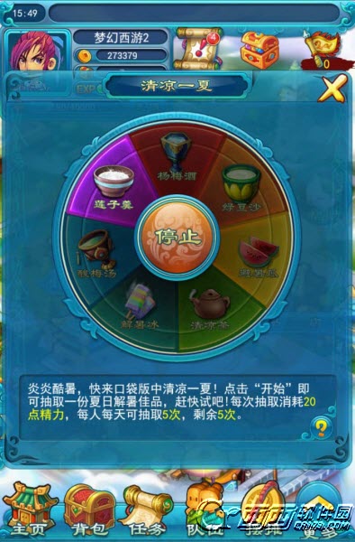 活动期间,玩家点击活动界面中"清凉一夏"图标即可进入玩法界面。在界面中点击“开始”按钮即可开始抽取冰饮。每人每天总计可以抽取5次,每次消耗20点精力,获得5点幻境暑假积分。