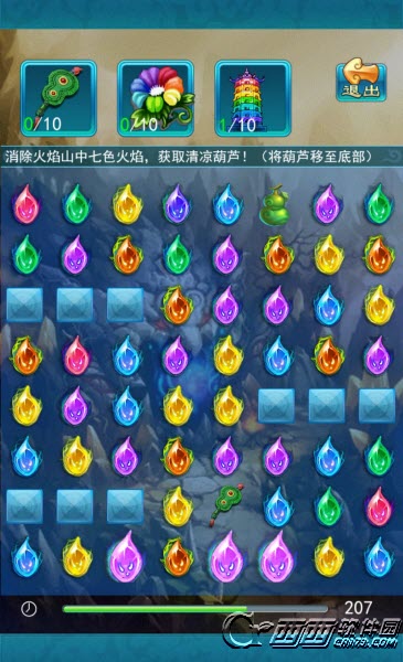 活动期间,玩家点击活动界面中"清凉火焰山"图标即可进入玩法界面。进入玩法之后,在规定时间内,将三团相同颜色的火焰连在一起即可消除火焰。当清凉葫芦移动到最下面一层时即可获得该葫芦。