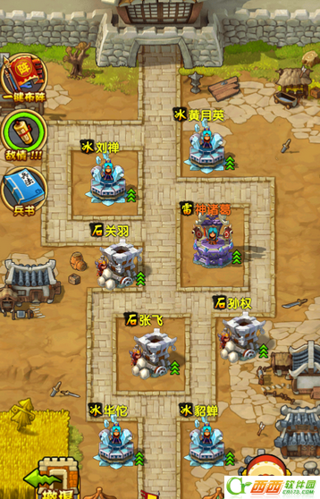 鄱阳9,这个图根据个人情况估计会大不相同,这是我自己的布阵,刘备的位置放最强弓箭,只是一个参考,第一个马车到了月英和孙尚香之间就鼓舞刘备击杀,然后抗晕又来了,再次鼓舞刘备击杀,后面就是看时机鼓舞了,兵跑的快就下冰雨,不过这关冰雨不能总是下,怪的血太厚,必须时刻注意鼓舞最强弓箭射杀。