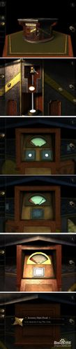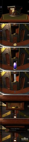 调查这个立方体,发现在底部有机关,旋转一下它的底部,它四周的三角形便弹起,变成了一个十字星形状的物体。我们找到盒子顶沿有十字星缺口的一侧,把刚才的十字星物体放进去,机关响动,盒子上面的平台弹起一个望远镜。